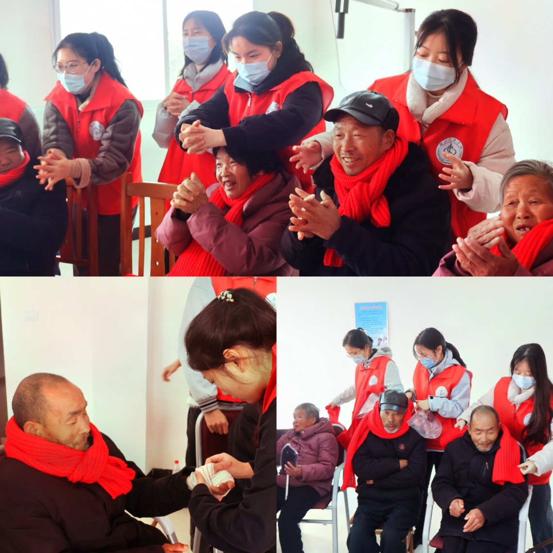 在石鼓镇农村福利院,我校护理学院研究生党员为老人们赠送围巾、手套等暖心礼物。志愿者们还为老人进行了歌唱表演、手势舞、击鼓传花等活动,营造温馨氛围,展示了海姆立克、绷带包扎术等急救知识实操。研究生党员带领老人学习“健脑”健身操,现场欢声笑语不断。在该活动现场同步开展义诊活动,护理学院师生为老人进行了血压、血氧测量及口腔健康筛查。