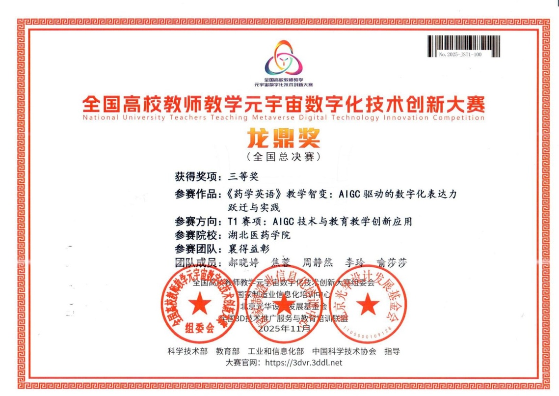 本网讯(通讯员 郝晓婷)近日,由科技部、教育部、工业和信息化部及中国科学技术协会指导,全国高校教师教学元宇宙数字化技术创新大赛组委会主办的第6届全国高校教师教学元宇宙数字化技术创新大赛(全国3D教师大赛)总决赛中,湖北医药学院“襄得益彰”教师团队凭借作品《〈药学英语〉教学智变:AIGC驱动的数字化表达力跃迁与实践》脱颖而出,荣获三等奖。