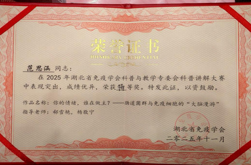 本网讯(通讯员 王冬梅 范思涵)2025年11月29日,湖北省免疫学会科普讲解大赛决赛在武汉市亚心总医院圆满收官。来自湖北医药学院第一临床学院2024级麻醉学班的范思涵,凭借作品《你的情绪,谁在做主?——肠道菌群与免疫细胞的“大脑漫游”》斩获大赛特等奖。