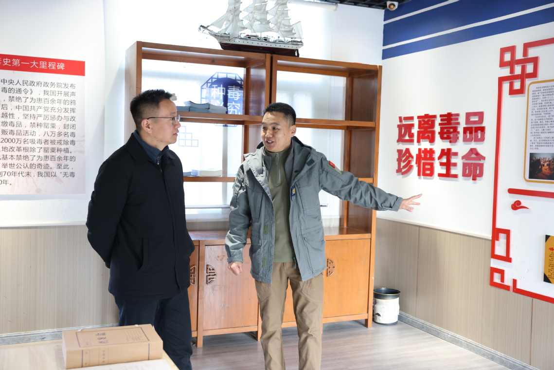 禁毒教育基地负责人介绍了基地禁毒宣传教育、互动实践体验等设施,表示将依托基地阵地功能,推动禁毒知识普及与思政教育同频共振。
