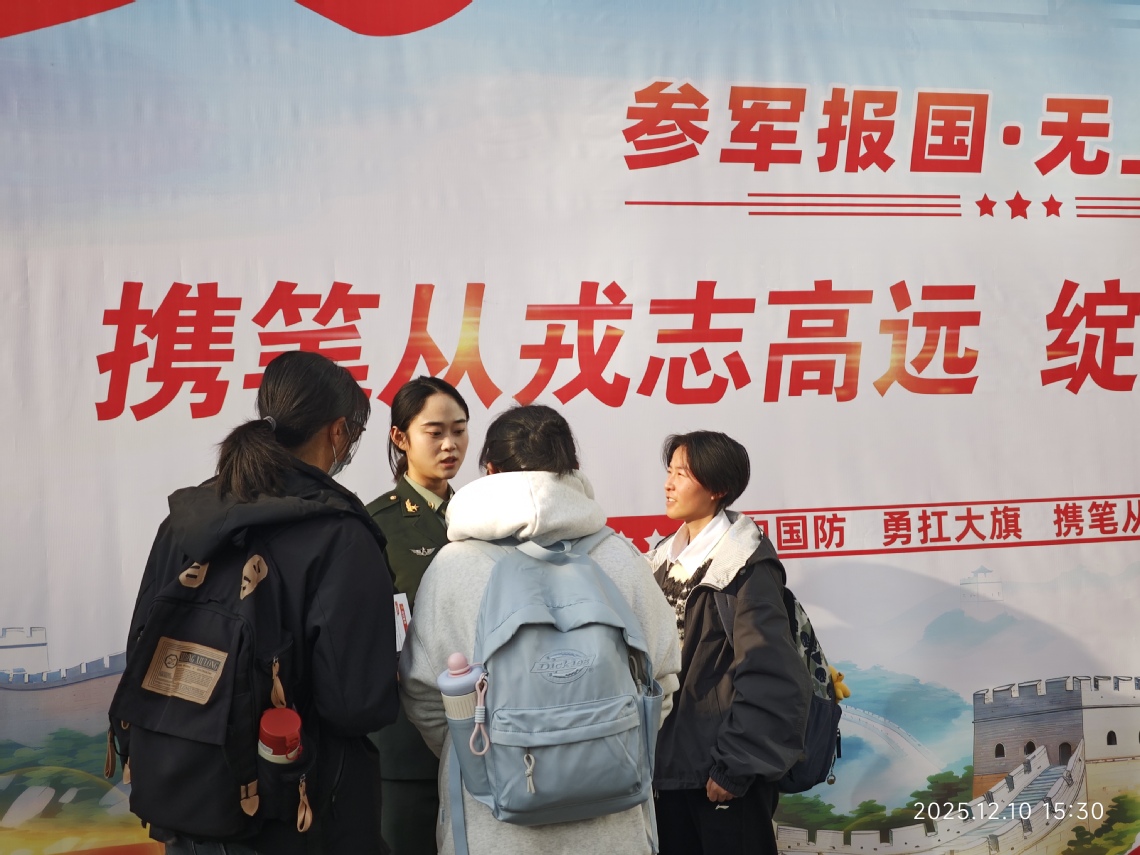 培训会场外,茅箭区人民武装部3名征兵专干和我校参加九三阅兵的优秀退役学生刘文萱面向有意愿参军的在校学生进行征兵政策宣讲,宣讲吸引了近二百名学生现场咨询。