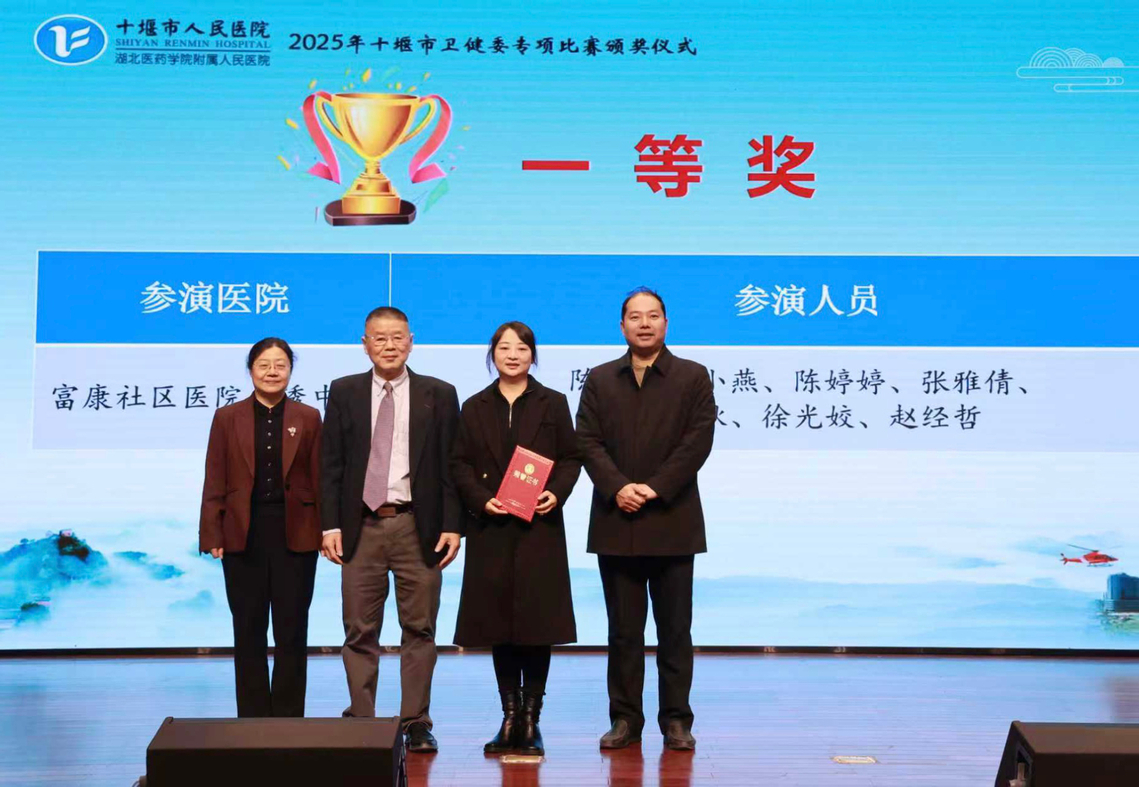 本网讯(通讯员 何欢 贺小燕) 近日,2025年十堰市肾脏病质控中心年会在直属附属人民医院学术报告厅召开,富康社区医院血液净化基地报送的血液透析健康宣教案例,凭借创新的理念与扎实的实践效果,荣获 大赛“一等奖”殊荣。直属附属人民医院党委书记昝琨、湖北省肾脏病质控中心主任丁国华,市卫健委四级调研员郭公孙共同为我院获奖团队颁奖,血液净化基地护士长何欢上台领奖。