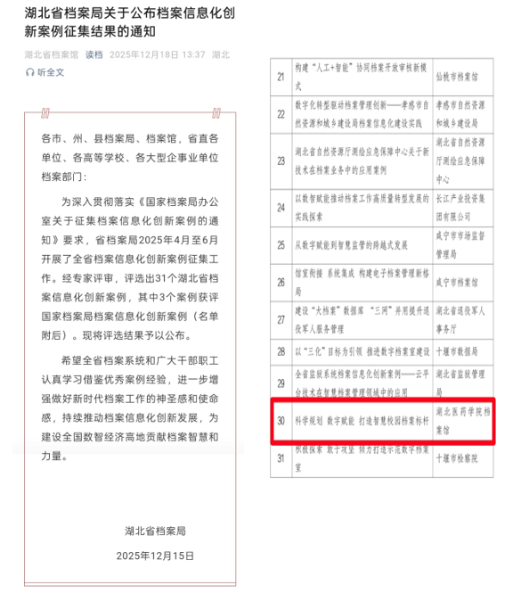 本网讯(通讯员 王华夏)湖北省档案局公布了档案信息化创新案例评选结果,我校档案馆申报的《湖北医药学院档案馆创建“湖北省示范数字档案馆”案例——科学规划数字赋能打造智慧校园档案标杆》成功获评“省级档案信息化创新案例”,这标志着我校在档案信息化建设领域取得了又一重要成果。