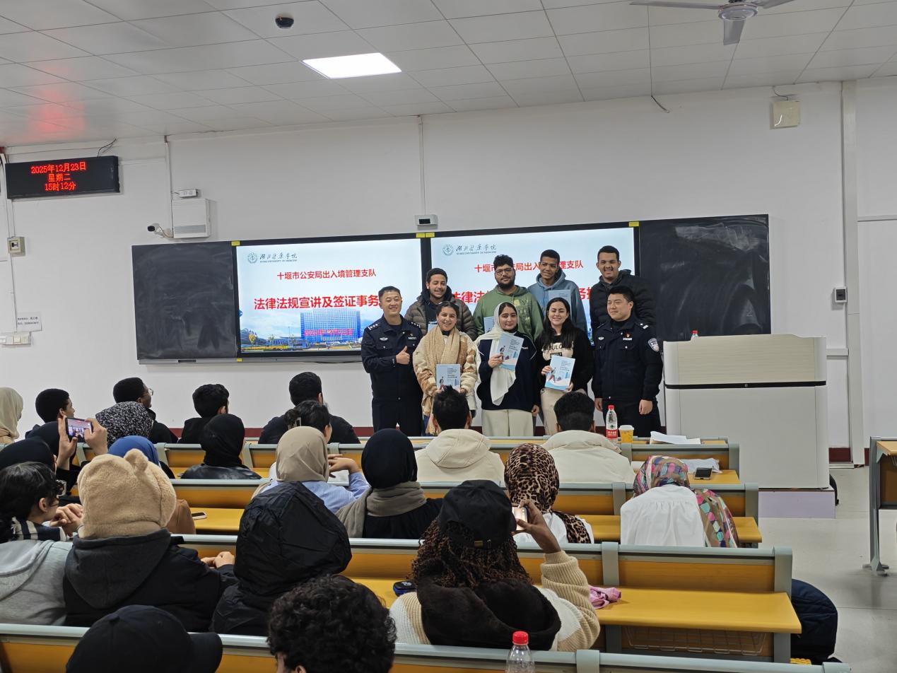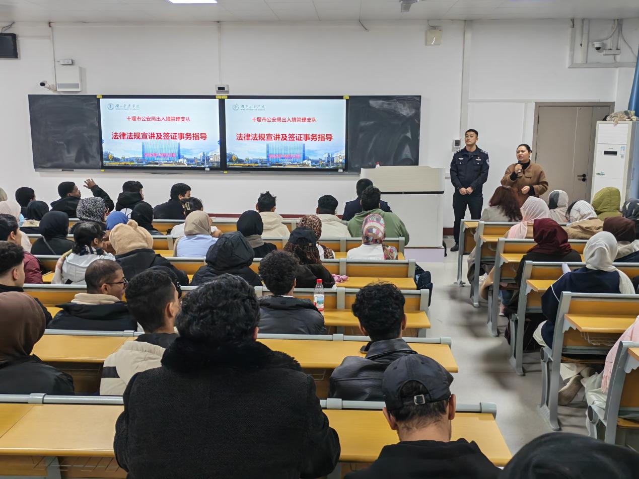 本网讯(通讯员 董丹妮)为增强留学生法治意识,保障其在华学习生活安全有序,国际教育学院特邀十堰市公安局出入境管理支队,于12月23日下午在3301教室开展法律法规宣讲暨签证事务指导会,全体留学生新生参会。