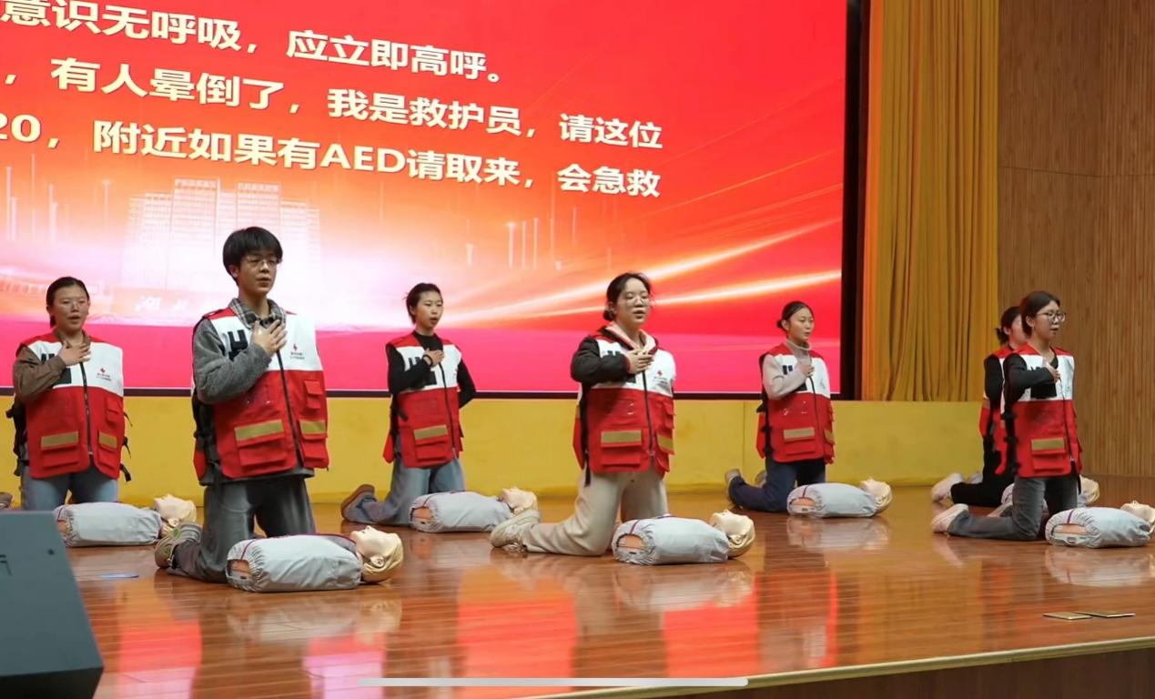 决赛现场,彩虹灾害医学救援志愿服务队以“实操+讲解”相结合的方式进行救护操作展示。伴随着清晰的步骤解说,队员完整演示了从评估环境、判断意识、胸外按压、人工呼吸等单人心肺复苏全流程,并现场模拟了自动体外除颤仪(AED)的取用、开机、贴电极片及电击除颤等关键操作。严谨准确的讲解与专业细致的操作,将应急救护知识转化为了一堂通俗易懂、生动鲜活的科普课程,赢得评委专家与现场观众的一致好评。