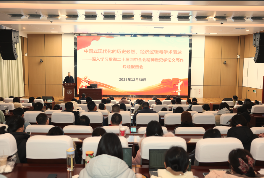 本网讯(通讯员 谢美娟)为深入学习贯彻党的二十届四中全会精神,深化对中国式现代化的理论认知与历史把握,提升全校教师学术研究与论文写作水平,12月30日上午,我校隆重举办“中国式现代化的历史必然、经济逻辑与学术表达——深入学习贯彻党的二十届四中全会精神暨史学论文写作专题报告会”。本次报告会邀请了中国社会科学院二级研究员、中国三线建设研究会会长武力,中国社会科学院二级研究员、中华人民共和国史学会副会长李正华,中共党史和文献研究院科研规划部二级巡视员、《中共党史研究》副主编、编审乔君三位国内知名专家作专题报告。校党委副书记、校长罗杰参加报告会并发表致辞,校党委常委、研究生院院长唐俊明主持。科学技术发展研究院、马克思主义学院、人文社会科学学院班子成员及相关学院教师、学生近300人参加了报告会。