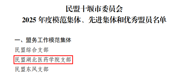 本网讯(通讯员 何志凯)近日,民盟十堰市委会在十堰市党派办14楼会议室召开六届二十次(扩大)会议暨2025年度总结表彰大会。会上,对2025年度优秀支部、优秀盟员进行了表彰。民盟湖北医药学院支部荣获“盟务工作模范集体”,基础医学院赵虎子、第一临床学院王刚荣获“优秀盟员”称号。