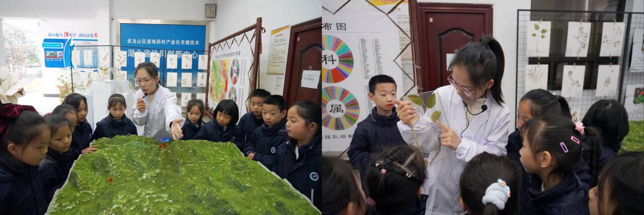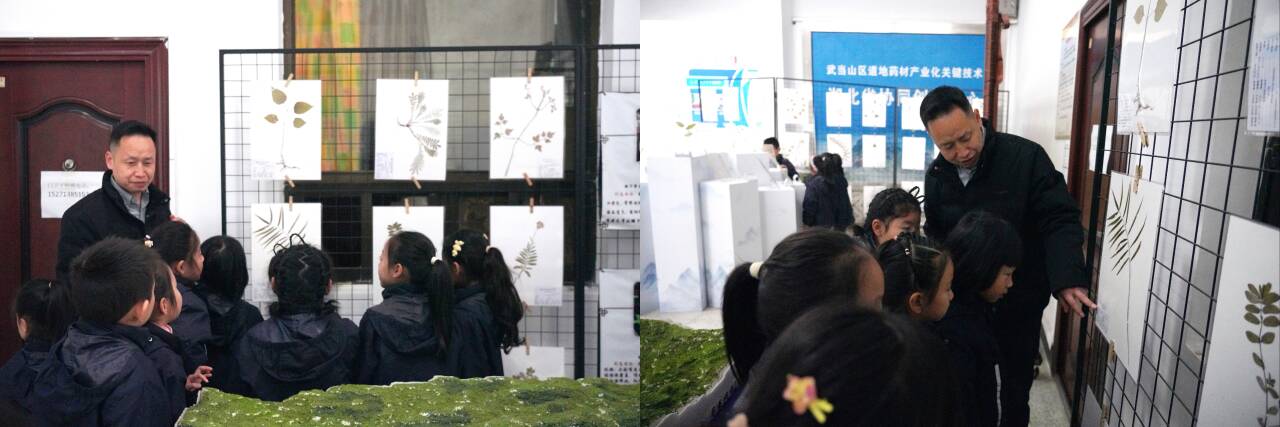 活动现场,“走进武当·寻医问药”实践队队长廖清妹化身“小小科普讲解员”,用亲切易懂、充满童趣的语言,为小朋友们介绍各类腊叶标本、水晶标本及浸液标本。廖清妹结合专业知识,细致讲解常见药用植物的生长习性、形态特征及药用价值,带领孩子们近距离观察、辨识中草药,感受本草魅力与中医药文化底蕴。