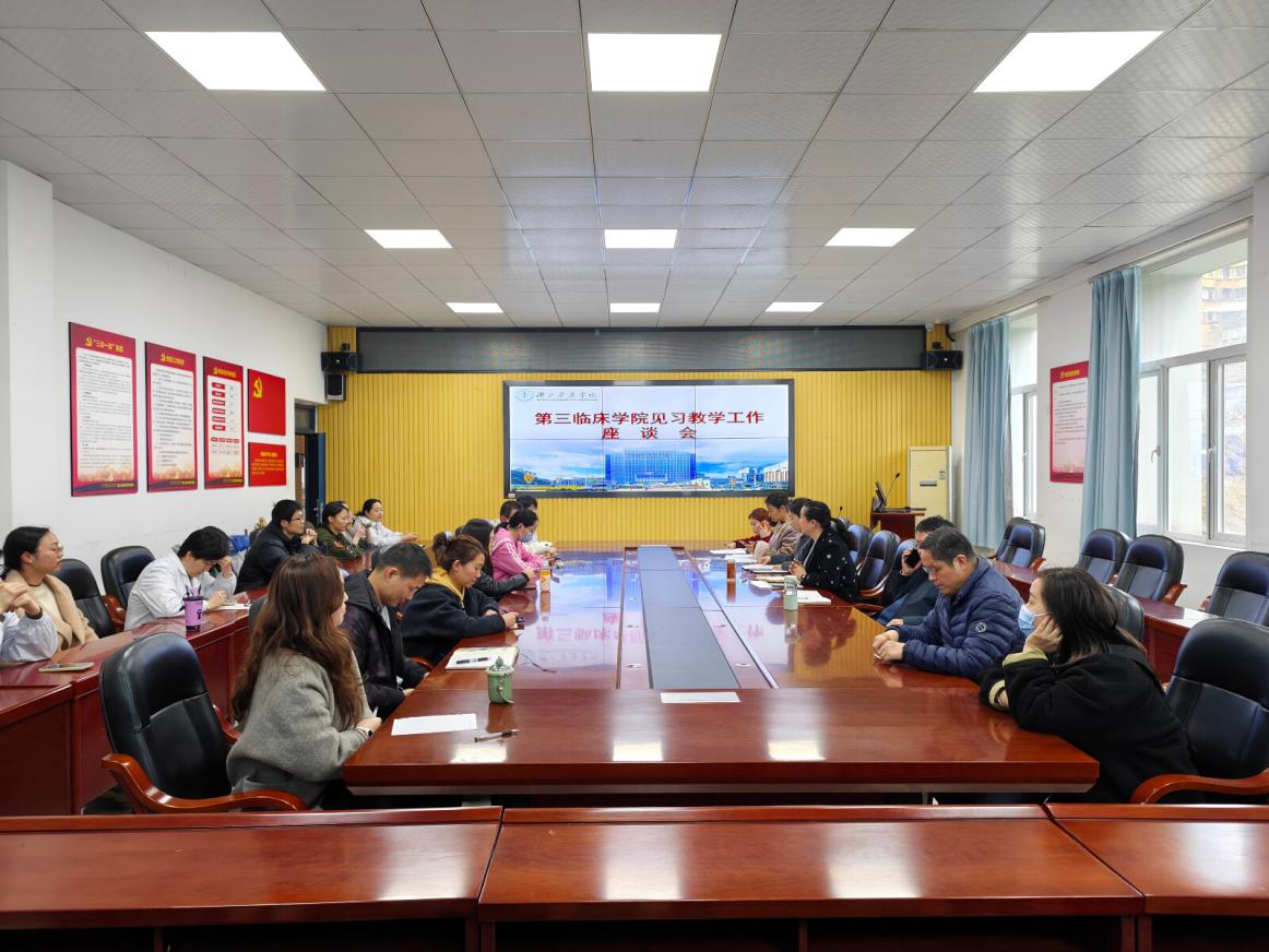 本网讯(通讯员 柳金金)为深入贯彻落实"教育教学提升年"工作部署,破解临床见习教学中的突出问题,3月25日下午,第三临床学院在教学楼一楼会议室召开临床见习教学工作座谈会。学院院长王家宁、党委书记桂程君、副院长薛锐,教学办工作人员及各教研室见习教师代表参加会议,会议由薛锐主持。
