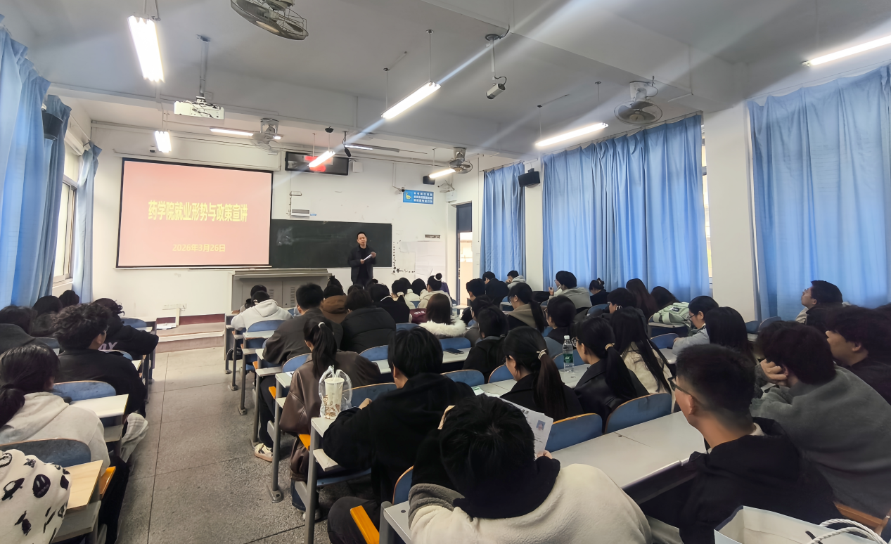 本网讯(通讯员 徐璠婧)3月26日,药学院党委书记郝新才为学院2026届毕业生开展就业形势与政策专题宣讲。药学院党委副书记廖婧羽、毕业班辅导员、返校毕业生参加宣讲会。
