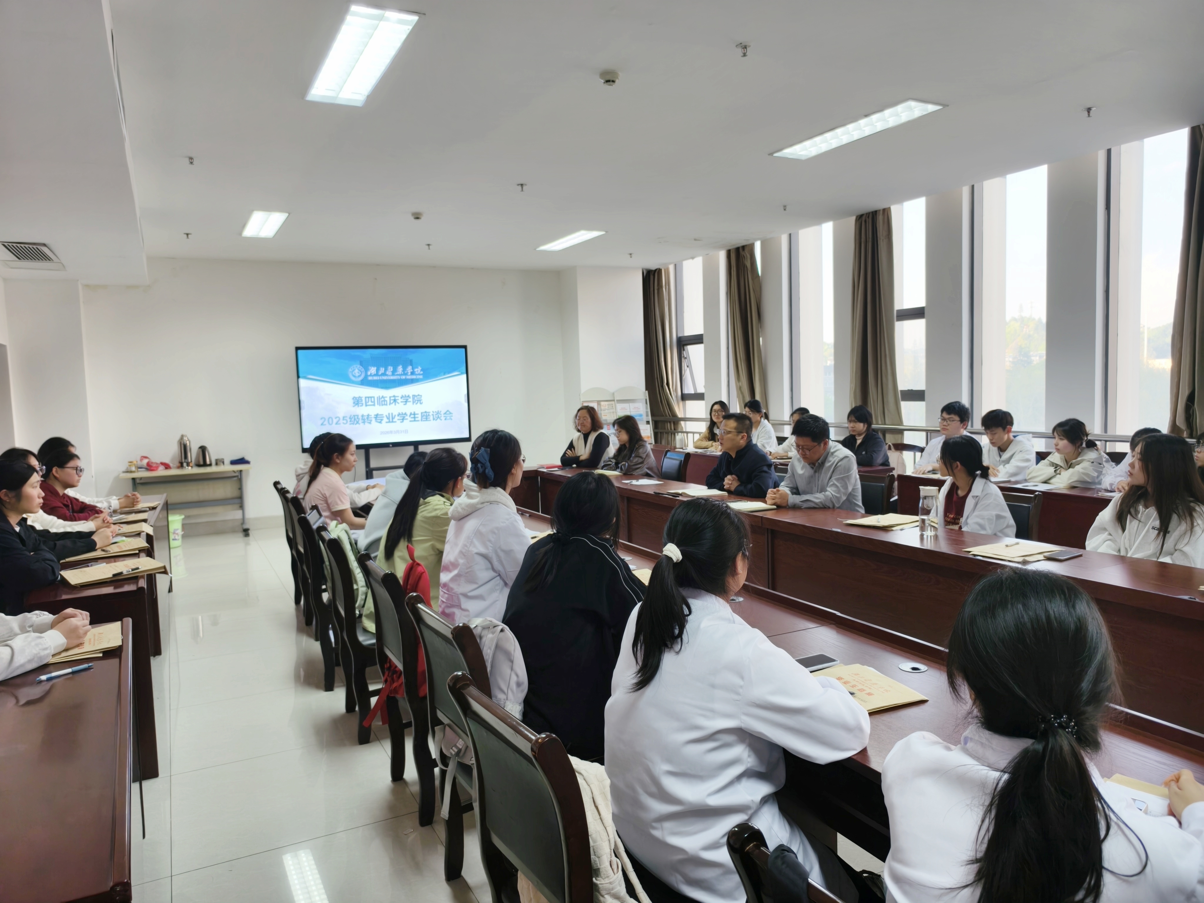 本网讯(通讯员 龙月娇)3月31日下午,第四临床学院在科教楼513会议室召开转专业学生座谈会。学院党委书记赵国新、党委副书记郑建超、学工办主任龙月娇、团委书记陈业史、教学办主任李玲以及转入第四临床学院的32名同学参加会议。