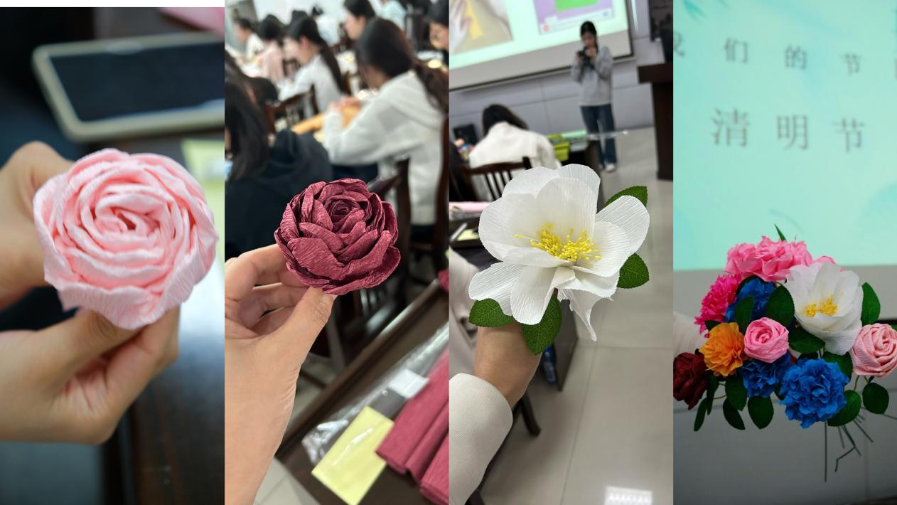 手工捻花环节中,师生们充分发挥想象力与创造力,有制作菊花以寄托对故人的深切缅怀,有捻制玫瑰以表达对生活的热爱与对未来的憧憬。同学们相互交流技巧、分享心意,使清明的思念更有仪式感。