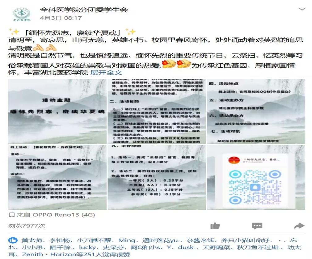 本网讯(通讯员 翟祥乐 黄悦)清明追思,薪火相传。为弘扬清明传统文化,厚植青年学子家国情怀,将节日文化与医德教育深度融合,4月4日至6日,湖北医药学院全科医学院以线上形式开展 “缅怀先烈志,赓续华夏魂” 清明节主题活动,学院全体学生踊跃参与,在云端寄哀思、敬英烈,传承红色精神,筑牢医者初心。
