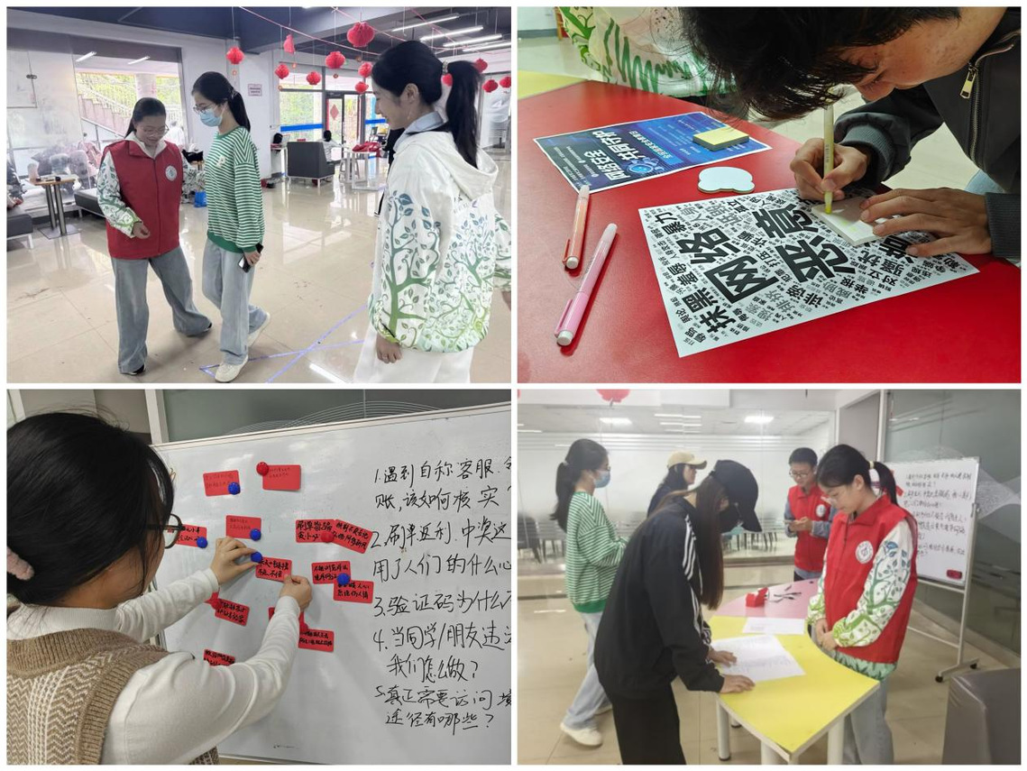 活动以“网络生存挑战”为主线,将规则认知、反诈识别、文明表达、综合闯关融为一体。同学们首先进入“边界陷阱——规则雷区”,闭眼在志愿者引导下盲走模拟“网络雷区”的通道,走错即被提醒,终点结合真实案例拆解违规行为的法律后果,让“网络不是法外之地”的理念入脑入心。紧接着转入“反诈极速辨骗——话术拆穿”,面对刷单返利、冒充亲友、游戏交易等高频骗局对话展板,同学们分组“找茬”诈骗话术漏洞,志愿者同步拆解套路,强化“不轻信、不透露、不转账”的防骗准则。随后进入“网络言行照妖镜——文明留言墙”,大家手持马克笔划除张贴的网络脏话、人身攻击、造谣歧视等不文明用语,并写下自己的文明宣言,将正能量留在墙上。最后,“终极安全大闯关”以小组答题竞赛形式,综合考察网络安全法规、反诈知识、文明上网规范等内容,志愿者针对易错题现场讲解,帮助同学们全面巩固所学。
