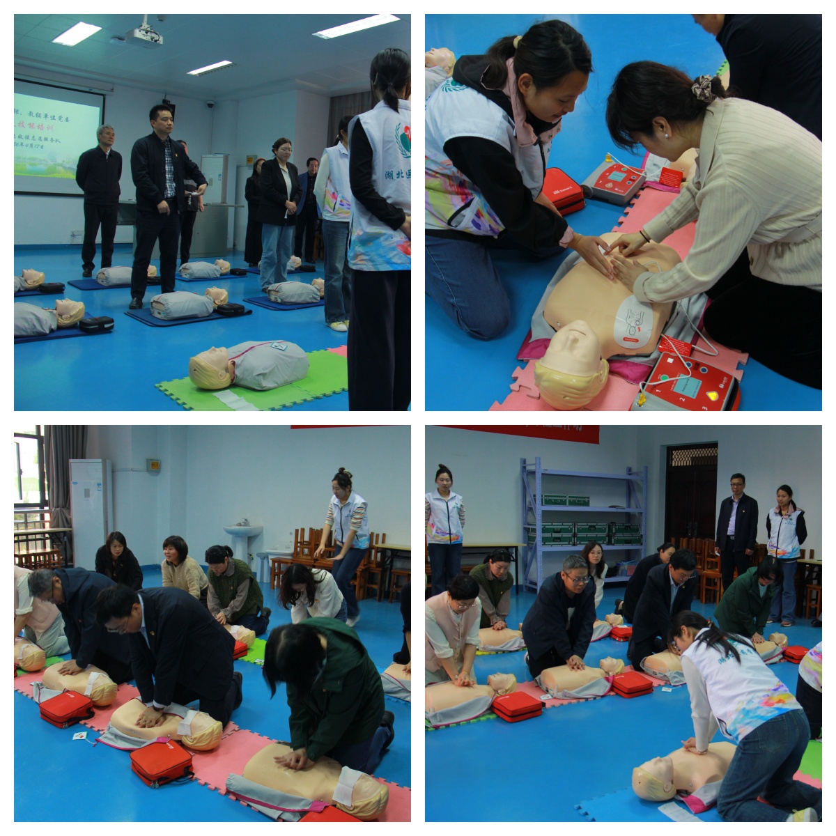 本次培训采用“理论授课+实操示范”相结合的方式,重点围绕紧急情况下的应急救护知识展开。临床技能中心刘翠老师系统讲解了呼吸心跳骤停的快速识别方法、心肺复苏术的核心要点以及自动体外除颤仪(AED)的正确使用流程。随后,“曙光急救”志愿服务队的志愿者们借助人体模型、AED教具等设备,进行了手把手、面对面的现场示范,细致拆解每一个操作步骤,耐心解答教职工提出的各类疑问。