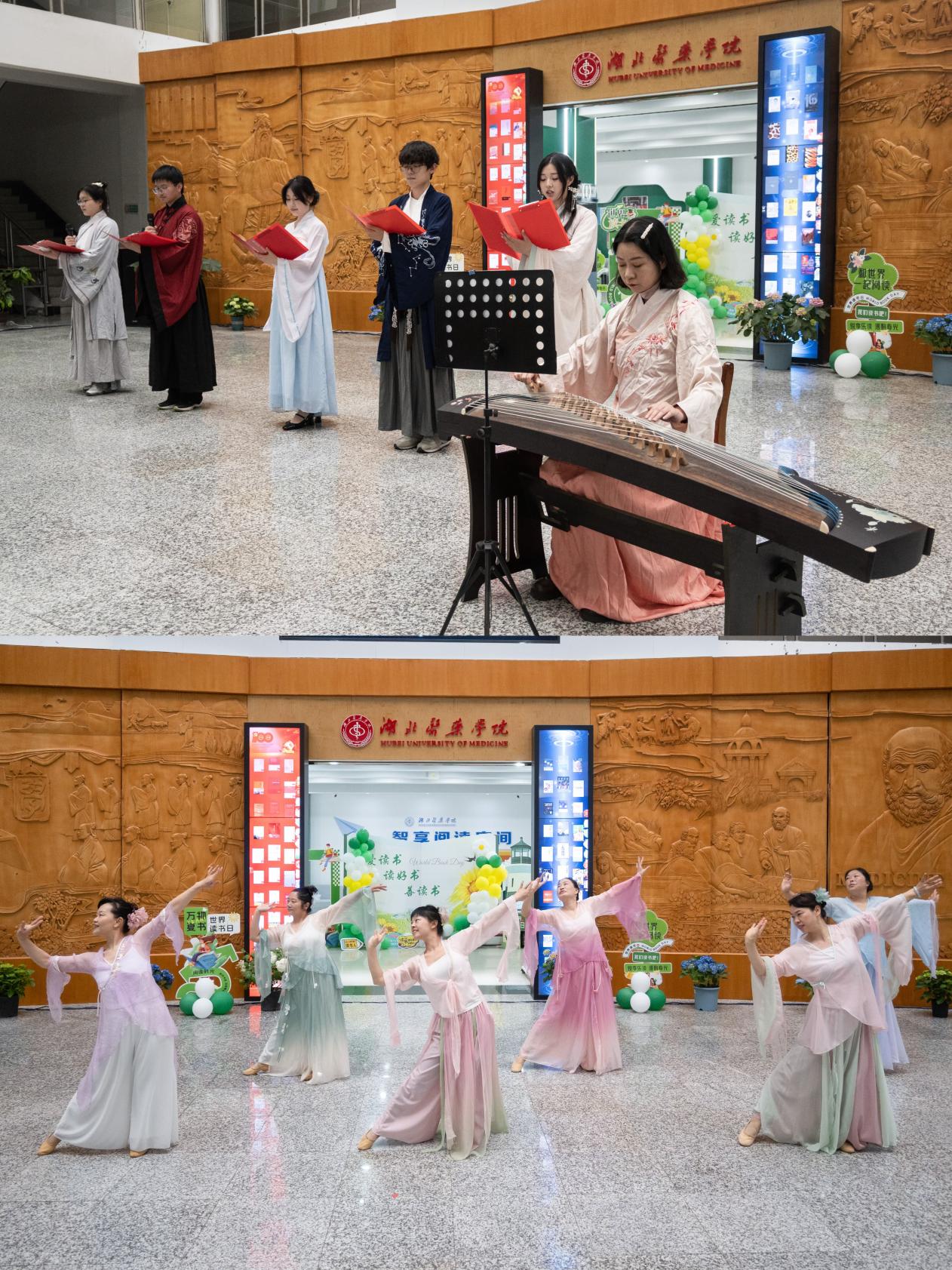 讲话结束后,由图书馆职工和汉江潮文学社同学共同带来,古筝伴诗朗诵《诗词歌赋里的中华》和歌舞串烧《快乐阅读吧!》既展现了图书馆职工风采,又彰显了当代学子蓬勃向上的精神面貌,将启动仪式氛围推向高潮。