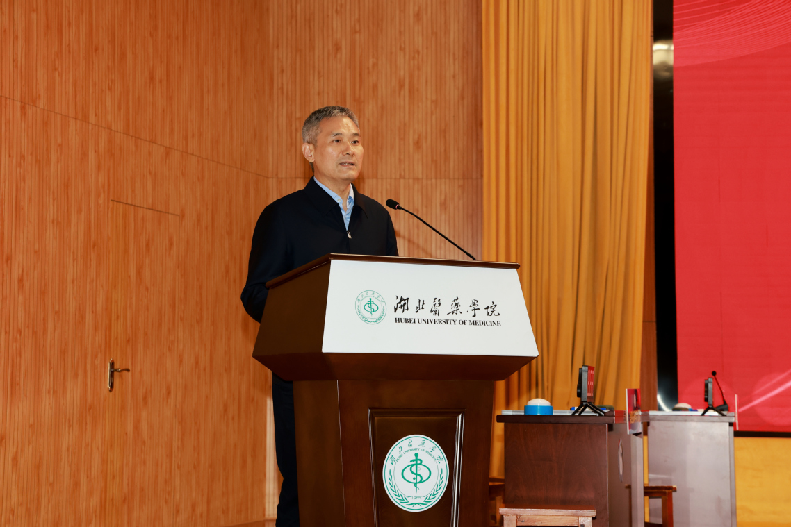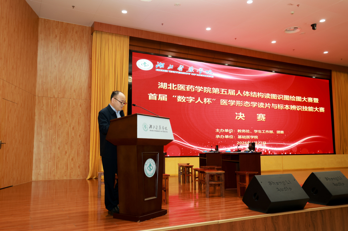 本网讯(通讯员文/丁演鹂图/沈君豪 学通社记者)为深入推进高等教育数字化转型,促进数字技术与医学形态学教学深度融合,4月27日晚,湖北医药学院第五届人体结构读图识图绘图大赛暨首届“数字人杯” 医学形态学读片与标本辨识技能大赛在科教楼一楼学术报告厅举行。大赛由教务处、学工处、校团委主办,基础医学院承办。校党委书记郑丹凤,校党委副书记、校长罗杰,校党委常委、研究生院院长唐俊明及各二级学院负责人出席活动,唐俊明主持,近600名师生现场参加。